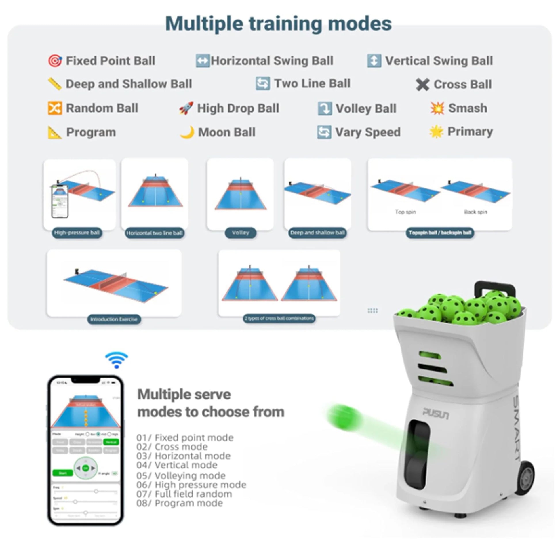 Balle à point fixe, balle d’élan horizontale, balle d’oscillation verticale, balle profonde et peu profonde, balle à deux lignes, balle croisée, balle aléatoire, balle à chute haute, Topspin, balle à effet arrière, balle à vitesse variable, auto-programmation, paramètres de balle par défaut, réglage de la vitesse, réglage de la fréquence.